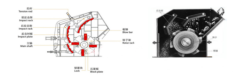 反擊式破碎機(jī)是一種利用沖擊能來(lái)破碎物料的破碎機(jī)械。機(jī)器工作時(shí),在電動(dòng)機(jī)的帶動(dòng)下,轉(zhuǎn)子高速旋轉(zhuǎn),物料進(jìn)入板錘作用區(qū)時(shí),與轉(zhuǎn)子上的板錘撞擊破碎,后又被拋向反擊裝置上再次破碎,然后又從反擊襯板上彈回到板錘作用區(qū)重新破碎,此過(guò)程重復(fù)進(jìn)行,物料由大到小進(jìn)入一、二、三反擊腔重復(fù)進(jìn)行破碎,直到物料被破碎至所需粒度,由出料口排出。調(diào)整反擊架與轉(zhuǎn)子之間的間隙可達(dá)到改變物料出料粒度和物料形狀的目的。